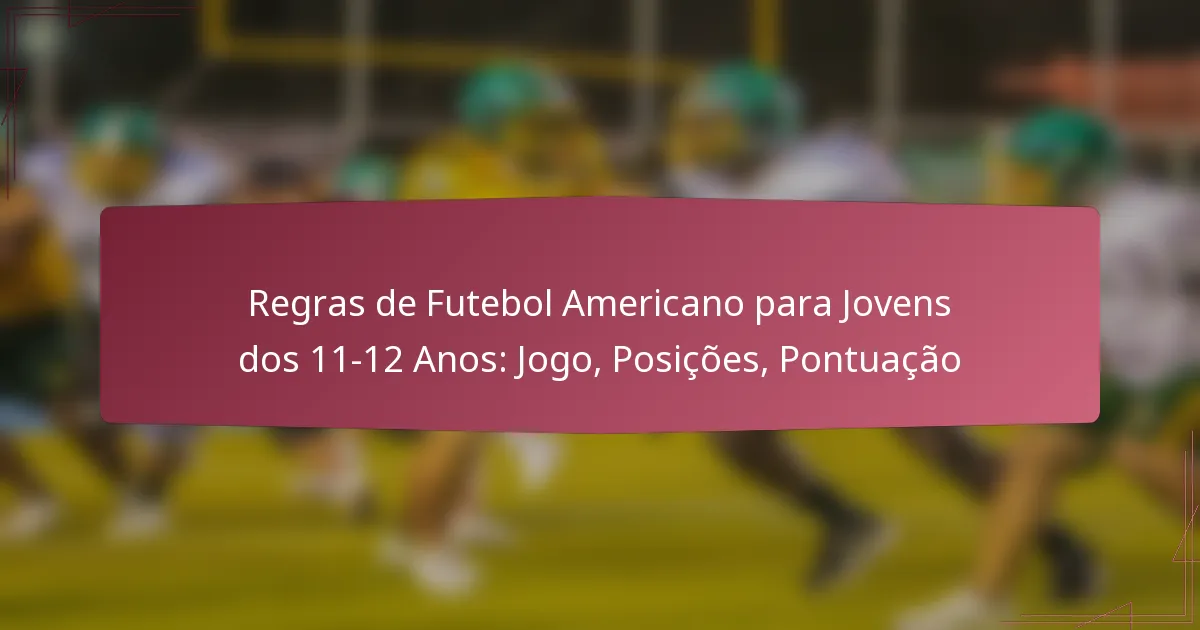 As regras principais para o futebol juvenil americano para jovens de 11-12 anos priorizam a segurança, a estrutura e o prazer, abrangendo aspectos como a duração do jogo, a segurança dos jogadores e a pontuação. Os treinos devem ser concebidos para melhorar o desenvolvimento de habilidades, ao mesmo tempo que promovem o trabalho em equipa e o espírito desportivo, garantindo um ambiente divertido para os jovens atletas. O formato do jogo incorpora regras modificadas para promover a segurança e o espírito competitivo, permitindo que os jogadores desenvolvam as suas capacidades num ambiente de apoio.